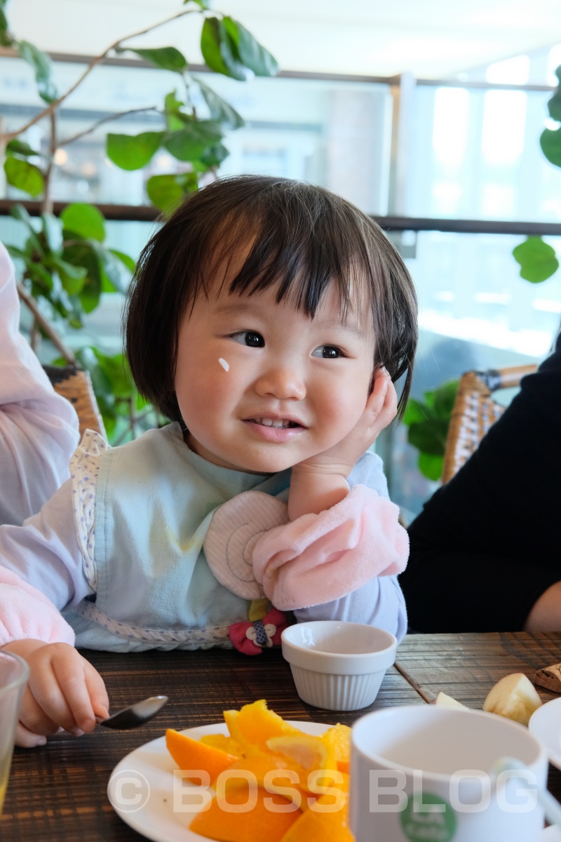 ◎叔母との記念撮影に呆れる姫ちゃん… ご飯粒もヤラセでさせられているのも踏まえて、あきれ顔(笑)